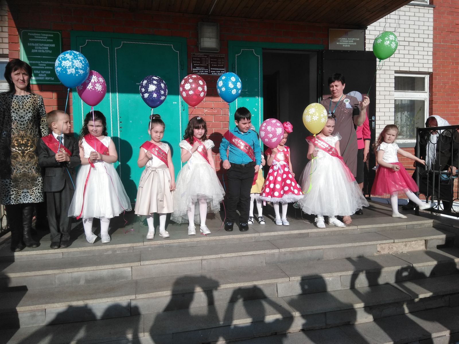В связи с тем, что в нашем саду идёт капремонт выпускной провели 19 апреля в сельском доме культуры. Царила необыкновенная атмосфера. Девочки в воздушных платьицах, мальчики в строгих костюмчиках собрались в зале. Родители то и дело поправляли пышные наряды своим чадам и беспрерывно щелкали фотоаппаратами. И те, и другие заметно волновались: ведь это было очень важное для ребят событие – первый в жизни выпускной бал. С этим праздником детей поздравляли все сотрудники детского сада, родители, и приглашенные на праздник гости.