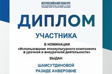 Наша школа участвовала во Всероссийском конкурсе среди общеобразовательных организаций на лучшую организацию работы по этнокультурному образованию в номинации "Использование этнокультурного компонента в урочной и внеурочной деятельности" и отмечена Дипломом участника. Будем стараться!