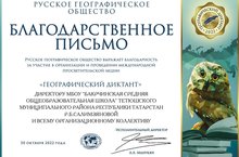Укытучылар һәм укучылар Географик диктант яздылар. «Географик диктант» - Рус география җәмгыяте тарафыннан 2015 елдан бирле ел саен җәмгыятьнең Попечительләр советы рәисе, Россия Федерациясе Президенты В.В.Путин инициативасы белән үткәрелә торган агарту акциясе. Аның төп максаты - географик белемнәрне популярлаштыру һәм халык арасында Россия географиясе белән кызыксынуны арттыру.