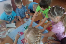 Просмотрев призентацию "Добрая дорога детства", дети узнали и открыли для себя много нового, после чего выполнили коллективную аппликацию "Дружат дети всей земли". Работа получилась очень яркой и солнечной, потому что, каждый ребёнок вложил в неё частичку своего тепла.