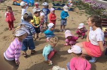 16.08.16. в младшей разновозрастной группе прошло музыкальное развлечение - «Веселая погремушка». На игровой площадке мы объединились в общий круг, где радостно и весело вспоминали танцы с нашими любимыми игрушками-погремушками.