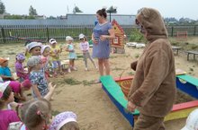 22 июля 2016 года воспитателем младшей группы Мальгиной О.Н. было проведено музыкально-физкультурное занятие «Пирожки для Мишки». В гости к ребятам приходил Мишка, с которым дети экспериментировали с песком, узнавали его свойства, делали куличи из сухого и сырого песка.