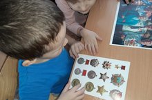 В рамках празднования 75-летия Победы в Великой Отечественной войне с детьми старшей-подготовительной группы прошла тематическая беседа .Дети просмотрели презентацию "Как это было", послушали песни военных лет, рассказали стихи. Побеседовав о боевых орденах и медалях, мы узнали, что ими награждались те, кто отличился во время боев Великой Отечественной войны. Таких людей было много, потому что наш народ мужественно сражался и победил! Ребята тоже нарисовали свои ордена и медали для наших ветеранов.