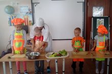 15 июля в старшей-подготовительной группе прошел «День овощей и фруктов». Ребята посмотрели поучительный мультфильм «Фиксики-витамины». После просмотра учились готовить овощной салат. Дети рассказывали о том, как родители делают домашние заготовки на зиму, как режут овощи для их приготовления. Кто-то из детей рассказывал о том, как помогал маме резать огурчики, помидоры для салата. И мы с детьми решили попробовать приготовить салат в группе. Дети рассмотрели овощи и выбрали среди них те, которые можно кушать в сыром виде. В ходе беседы выяснили, что перед приготовлением салата, овощи надо хорошо вымыть. Что дети и сделали с большим удовольствием. Помыли помидоры, огурцы, перец, зелень. Поговорили о правилах безопасного и аккуратного пользования ножом. Показали и объяснили детям, как правильно резать овощи. А потом ребята сами их резали. В ходе резки выяснилось, что мальчики наравне с девочками, а где-то и лучше справились с поставленной задачей. Выкладывали салат в салатницу. Посолили салат и заправили растительным маслом. Учились правильно перемешивать салат. Наш салат готов! Ах, как пахнет! Салат оказался очень вкусным.