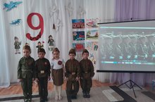 Төп чара Җиңү көненә багышланган " Без хәтерлибез - без горурланабыз!». Бәйрәм тантаналы музыка астында залга кергән өлкән яшьтәге балаларның саф маршыннан башланды. Чара барышында балалар Ватан турында шигырьләр сөйләделәр, җырлар җырладылар, Бөек Ватан сугышы чорлары турында видеороликлар карадылар, сугыш еллары җырлары тыңладылар, хәрби техника һәм гаскәрләрнең нәселләре турында викторина сорауларына актив җавап бирделәр, шулай ук һәлак булган солдатларны бер минут тынлык белән искә алдылар.