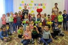 Сегодня в нашем детском саду было проведено мероприятие «Подари улыбку другу». Цель мероприятия – создать радостное настроение, научить детей доброжелательно относиться друг к другу. Улыбка – это чудо, с помощью которого в мире становится уютнее и теплее. Символом улыбки стал улыбающийся смайлик. Ребята на празднике отгадывали загадки, играли в такие игры как: «Передай улыбку», танец - игра «Хочешь быть моим хвостом?», «Веселые вопросы», игра – эстафета «Нарисуй солнышко», «Если весело живется». Все вместе сделали зарядку «Весёлые мартышки». С хорошим настроением и светящимися от счастья глазами воспитанники подарили друг другу веселые смайлики и спели песню «От улыбки». Улыбнись! И на душе станет теплее.