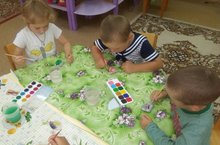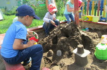 Сегодня в детском саду проводился конкурс построек из песка: «Песочные фантазии». Ребята старшего возраста фантазировали на различные темы и чувствовали себя хозяевами своего сказочного мира. Постройки были самые разнообразные: это были и волшебные замки, и сказочные домики, и даже чудесные торты. А к детям младшего возраста в гости приходил Петушок и познакомил их со свойствами песка и воды. Затем малыши вместе с Петушком лепили пирожки и украшали их.
