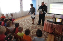 Сегодня наш детский сад посетили гости: сотрудник «Форпост» Ф.А. Рамазанова и инспектор ГИБДД А.Ф. Садыков. Инспектор ГИБДД провел с детьми беседу о правилах поведения на дорогах, о ремнях безопасности и детском кресле в автомобиле. Ф.А Рамазанова провела с детьми викторину о дорожных знаках и сигналах светофора, а также о правилах поведения в общественном транспорте, сопровождая свой рассказ презентацией. А затем ребята посмотрели мультфильм о правилах дорожного движения из сериала: «Белка и Стрелка. Озорная семейка». В завершении беседы Азат Фиркатович подарил детям подарки: памятки о правилах поведения на дорогах и книжки-раскраски.