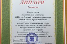 Дипломом 1 степени награжден театральный коллектив детского сада "Сказка", признанный победителем муниципального этапа театрального фестиваля - конкурса "Саяр" в возрастной категории 3-6 лет. Воспитанники старшей и подготовительной групп под руководством воспитателя по обучению татарскому языку Абдурахмановой А.В. и музыкального руководителя Минневалиевой Л.И. подготовили театрализованную постановку по мотивам татарской народной сказки "Лиса и гусь". По итогам муниципального этапа видеоролик с постановкой был направлен на республиканский этап театрального конкурса -фестиваля "Саяр".