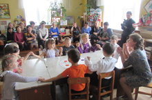 Праздник завершился небольшими подарками: дети подарили взрослым открытки с нарисованными на обратной стороне рисунками, а взрослые подарили детям шарики, с которыми дети с большой радостью играли в зале.