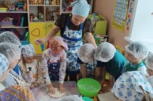 Весь процесс приготовления теста ребята проделали самостоятельно, под чутким контролем педагога, готовое тесто отнесли на кухню и попросили поваров им помочь.