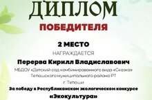 За победу в Республиканском экологическому конкурсе "Экокультура" в номинации "Декоративно- прикладное искусство" дипломом за 1 место награждена Торгайкина Тамара Анатольевна, воспитатель логопедической группы .