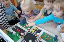 В рамках Месячника безопасности были проведены ряд мероприятий во всех возрастных группах. Ребята познакомились с макетом города, определили тротуар, проезжую часть. Воспитанники второй младшей группы смоделировали проблемную ситуацию -Мишка попал в большой город и не знает, как по нему безопасно передвигаться. Дети научили его переходить дорогу по пешеходному переходу. -