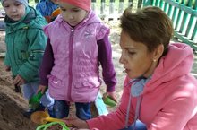 В первой младшей группе прошло занятие «Волшебный песок». На прогулке дети исследовали свойства песка, определили какой песок можно просеять, а из какого можно лепить куличики. Дети с удовольствием экспериментировали и даже определили, что на мокром песке можно рисовать как на листе бумаги.