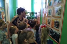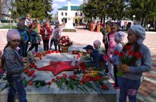 Олы төркем тәрбияләнүчеләре тәрбияче Мусташкина Т. Б. һәм кече тәрбияче Афонина С. А. белән берлектә Дан һәйкәле янында Мәңгелек ут янына чәчәкләр салдылар. Күп кенә ата-бабаларның сугышта булган һәм исән-сау әйләнеп кайткан, башкаларның сугыш кырларында ятып калган, шуңа күрә һәр кешегә якын бу авыру. Безгә гомер бүләк иткән геройлар турындагы истәлек буыннан-буынга кадерләп тапшырылырга тиеш.