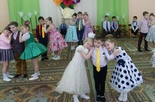 Воспитанники старшей группы «Светлячки» пригласили своих мама и бабушек на ретро-концерт, где дети «снимали» фильм о «Стилягах». Песни, танцы и одежды были подобраны в соответствии с темой. Очень красиво звучали песни «Чудеса», « Мы маленькие звезды», дети исполнили зажигательные танцы «Стоят девчонки», «Ландыши», «Рок-н-ролл». Бабушки с удовольствием угадывали мелодии песен в игре «Бабушкин патефон». Финальной точкой всего концерта был трогательный танец мам с сыновьями. В заключение праздника, все присутствующие в зале женщины получили подарки от детей.