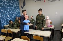 В рамках федерального проекта «Точка роста» 24 сентября в ГБОУ «Тетюшская кадетская школа-интернат» с воспитанниками 10 класса учителем ОБЖ Чалышевым А.П. был проведен урок с использованием тренажеров-манекен. Обучение на них безопасно, имеется неограниченная возможность создания и моделирования простейших критических ситуаций, при которых необходимо оказание первой медицинской помощи. При этом, у кадет формируется четкое представление о приемах первой доврачебной помощи. Использование таких тренажеров позволяет сделать учебный процесс в рамках предмета наглядным, ощутимым и активным, добиться того, что воспитанники не будут стоять в стороне, став свидетелем несчастного случая. Кадеты освоили практические навыки оказания первой медицинской помощи пострадавшему при проведении искусственной вентиляции легких, непрямого массажа сердца и первой медицинской помощи при огнестрельном ранении голени и руки. Следующий манекен позволил на практике усвоить первую медицинскую помощь при попадании инородного тела в дыхательные пути потерпевшего.