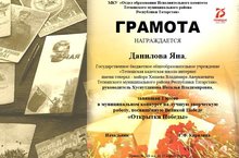 1 место в средней группе заняла Данилова Яна, воспитанница 7 класса, за работу: «Мы гордимся вашими подвигами»;