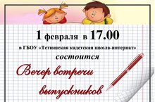 1 февраля в 17.00 в ГБОУ "Тетюшская кадетская школа-интернат" состоится ВЕЧЕР ВСТРЕЧИ ВЫПУСКНИКОВ