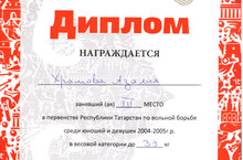 Поздравляем воспитанницу 6 класса Храмову Азалию, занявшую 3 место в первенстве Республики Татарстан по вольной борьбе среди юношей и девушек 2004-2005 г.р. в весовой категории до 33 кг. Желаем дальнейших успехов.