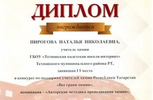 8 июня учитель химии Пирогова Наталья Николаевна выступила с презентацией своей программы элективного курса «Химия элементов», заняв 2 место в конкурсе по поддержке учителей химии Республики Татарстан «Все грани химии» в номинации «Авторская методика преподавания химии». В данном конкурсе организованном КНИТУ, участвовали педагогические работники системы общего образования различных типов и видов образовательных учреждений из 20 муниципальных районов РТ.