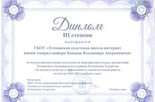 ГБОУ «Тетюшская кадетская школа-интернат» по итогам рейтингования деятельности общеобразовательных организаций Тетюшского муниципального района РТ «За высокое качество и эффективность воспитательной работы по итогам 2016-2017 учебного года» награждена Дипломом III степени. Заместителю директора по ВР Афанасьевой Р.Г. вручена Благодарность.