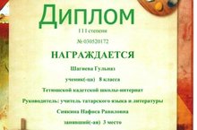 Наши кадеты продолжают активно участвовать в мероприятиях, посвященных празднованию 131 годовщины великого татарского поэта Г.Тукая. На республиканском конкурсе творческих работ «Тукай безнең күңелләрдә” (“Тукай в наших сердцах”) в номинации «Литературное творчество-эссе» дипломом III степени награждена вспитанница 8 класса Шагиева Гульназ. ( Руководитель Сиякина Н.Р)