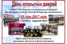 День открытых дверей в ГБОУ «Тетюшская кадетская школа-интернат имени генерал-майора Хапаева Владимира Аверкиевича» состоится 19 мая 2017 года в 10.00 ч. (здание №1).