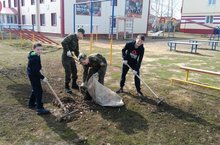 28 апреля в рамках соблюдения Правил благоустройства города Тетюши воспитанники 8 класса (воспитатель Маркелов А.А.) и 10 класса (воспитатель Костин С.Г.) ГБОУ «Тетюшская кадетская школа-интернат» вышли на общегородской субботник по генеральной очистке закрепленной территории от мусора, побелке бордюров и бетонных опор.