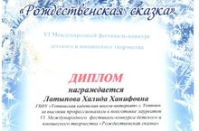 За высокий профессионализм в подготовке лауреатов VI Международного фестиваля – конкурса детского и юношеского творчества «Рождественская сказка» Дипломом награждена педагог-организатор, педагог дополнительного образования, учитель музыки Тетюшской кадетской школы-интерната Латыпова Х.Х.
