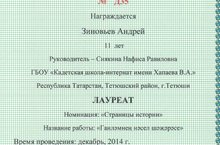 Лауреатами Всероссийского творческого конкурса «Фея мира знаний-1» стали воспитанники Кадетской школы-интернат: Семенова Полина- 9 класс в номинации «Исследовательская работа» и Зиновьев Андрей- 5 класс в номинации «Моя родословная». Руководитель: учитель татарского языка и литературы Сиякина