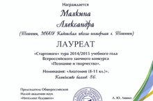 Воспитанница 9 класса Малкина Александра стала Лауреатом "Стартового тура 2014-2015 учебного года "Познание и творчество" в номинации "Анатомия (8-11 классы) (руководитель Афанасьева Р.Г.).