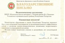 Педагогическому коллективу Кадетской щколы-интернат г. Тетюши вручено Благодарственное письмо Министерства образования и науки Республики Татарстан за целеустремленную и эффективную работу в развитии военно-патриотического воспитания подрастающего поколения.