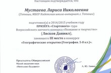 Воспитанники 8 класса МБОУ "Кадетская школа-интернат г. Тетюши имени Хапаева В.А." Лисков Даниил и Шныриков Виктор стали призерами "Стартового тура" Всероссийского заочного конкурса "Познание и творчество" и заняли 3 место в конкурсе "Географические открытия (география 5-8 классы)" (руководитель учитель геграфии Мустаева Л.Н.)