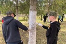 Кадеты занимаются благоустройством территории школы. Побелены бордюры. Защищены от вредителей-насекомых и палящих лучей солнца ели. Приведен в порядок газон. Строевой плац блистает чистотой и порядком