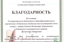 За сохранение и популяризацию родных языков и культуры среди подрастающего поколения и активное участие в мероприятиях, приуроченных Году родных языков и народного единства в Республики Татарстан Благодарностью Главы Тетюшского муниципального района Республики Татарстан награждено Государственное бюджетное общеобразовательное учреждение «Тетюшская кадетская школа-интернат имени генерал - майора Хапаева Владимира Аверкиевича».