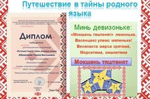 Команда учащихся 6-8 классов "Мокшень тяштенят" стала победителем в дистанционной олимпиаде по мордовсому (мокшанскому, эрзянскому) языкам "Путешествие в тайны родного языка" среди обучающихся общеобразовательных организаций Республики Мордовия и мордовской диаспоры. Руководитель команды Абраконова Г.В., учитель родного языка и литературы. Олимпиада проходила на площадке ГБО ДПО РМ "Центра непрерывного повышения профессионального мастерства педагогических работников – «Педагог 13.ру»". -