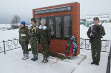 Участники военно-патриотической игры "Зарница-2015" возложили гирлянду Славы к памятнику Павших в Великой Отечественной войне, почтили память павших минутой молчания.