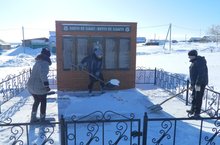 Учащиеся 7 класса вместе с педагогом-организатором Абраконовой Т.В. убрали снег вокруг Памятника павшим в ВОВ.