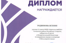 Учащаяся 11 класса Родионова Ксения приняла участие в Межрегиональной олимпиаде "Тайны родного языка" и заняла 2 место. Руководитель:учитель родного языка и литературы Абраконова Г.В. Поздравляем!!! Желаем дальнейших успехов!