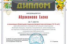 Поздравляем Абраконову Елену, обучающуюся 7 класса, ставшую победителем в конкурсе на лучшую новогоднюю ёлочную игрушку, реализованного на портале по безопасности дорожного движения "Сакла", в рамках республиканского образовательно-воспитательного проекта "Дневник безопасности школьника".
