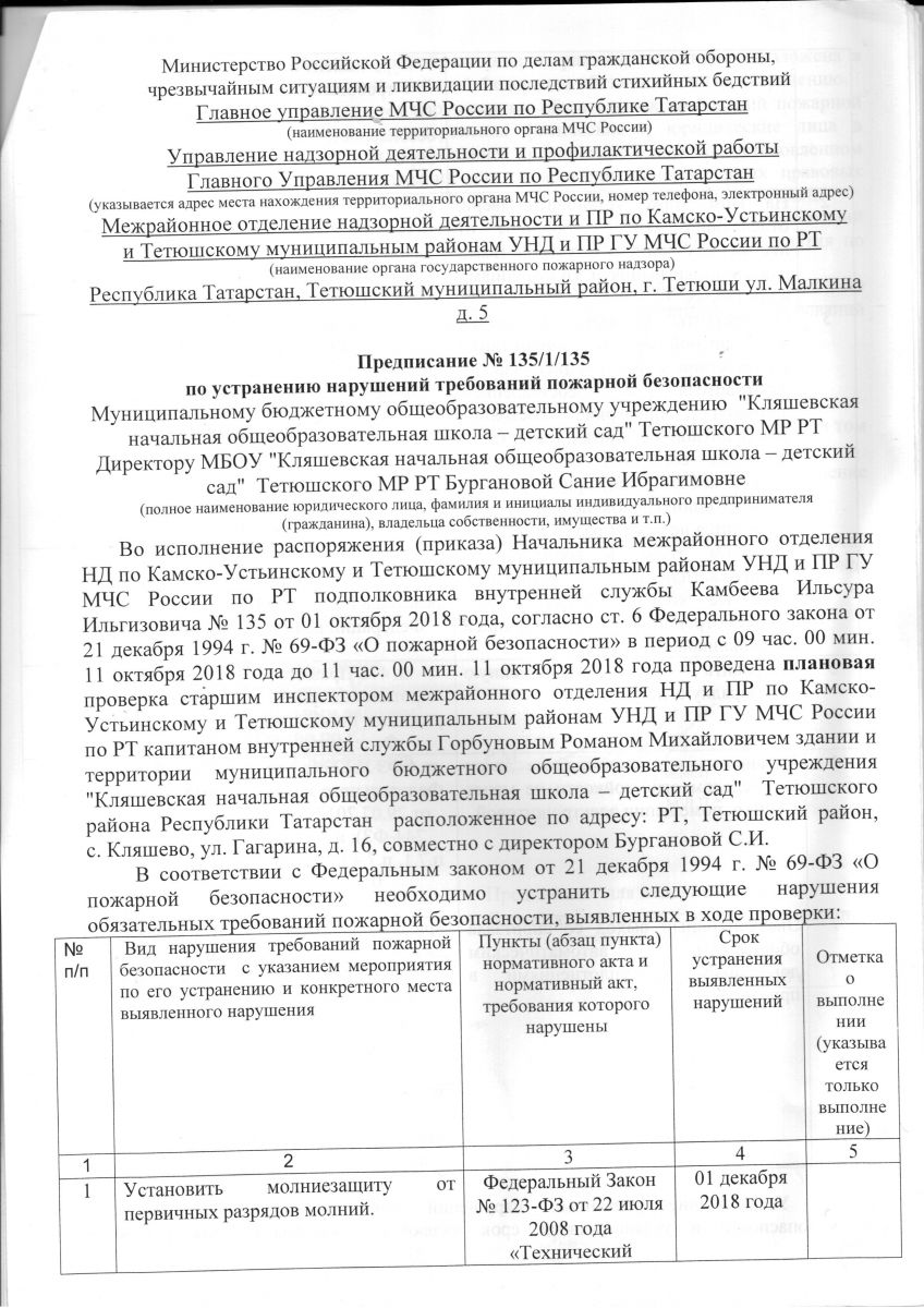 Предписание по устранению нарушений требований пожарной безопасности