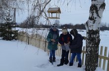 Учащиеся 3, 4 классов подкладывают корм для птиц на кормушки, которые изготовили сами.