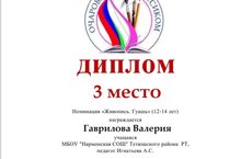 По итогам республиканского конкурса изобразительного искусства "Очарованные классиком" Гаврилова Валерия награждена дипломом за 3 место в номинации "Живопись. Гуашь" (руководитель Игнатьева А.С.)