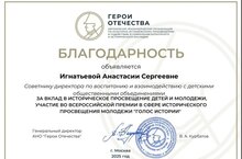 Советник директора по воспитанию Игнатьева Анастасия Сергеевна приняла участие во Всероссийской премии «Голос истории», организованной автономной некоммерческой организацией «Герои Отечества», и получила благодарность за вклад в историческое просвещение детей и молодёжи.