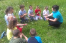 Лето не балует нас солнышком. Прохладно и сыро после ливня. Взбодрила ребят с утра зарядка.