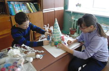 Сегодня ребята побывали в творческой мастерской "Зимние узоры". Смастерили настольную композицию "Хоровод вокруг елки".