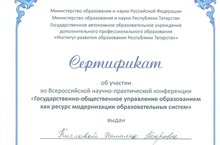 20 ноября Кислова Н.П., заместитель директора по УР приняла участие во Всероссийской научно-практической конференции «Государственно-общественное управление образованием как ресурс модернизации образовательных систем» г. Казань.