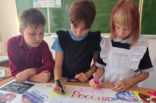 Под руководством советника директора по воспитанию Игнатьевой А. С. Орлята России создали плакат "Одна страна-одна Россия", где отразили свою любовь к Родине, культуру России, её единство и историю. -