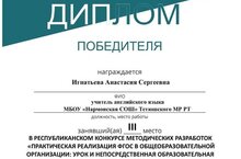 По итогам республиканского конкурса методических разработок конспектов уроков и непосредственной образовательной деятельности «Практическая реализация федеральных государственных образовательных стандартов в общеобразовательной организации: урок и непосредственная образовательная деятельность» учитель английского языка Игнатьева А. С. награждена дипломом за III место. Поздравляем!